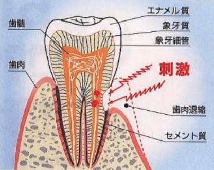 つまり、ほとんど原因で歯質が露出することにより外来刺激(冷気、冷水、酸味・甘味食品、歯ブラシなどによる刺激)が象牙細管歯髄(神経)に伝わると歯に瞬間的な痛みが生じます。