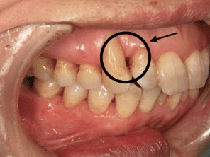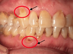 ①歯周病による歯根露出