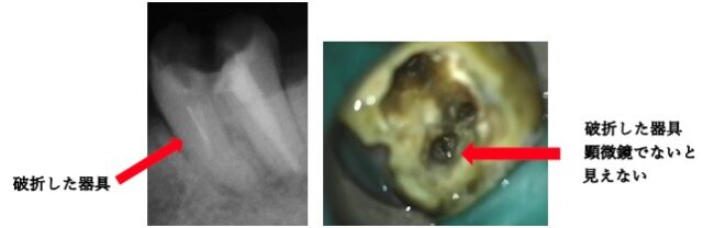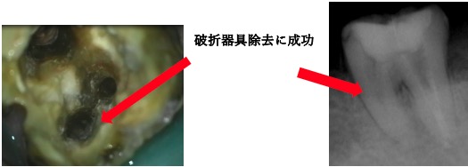 マイクロスコープで高倍率に拡大し、破折した器具の頭を確認。特殊な超音波器具を用いて、周りの歯を削りすぎないように慎重に振動を与え、器具を除去することに成功しました。